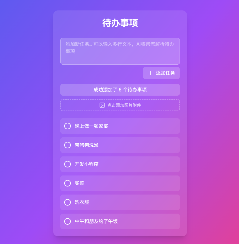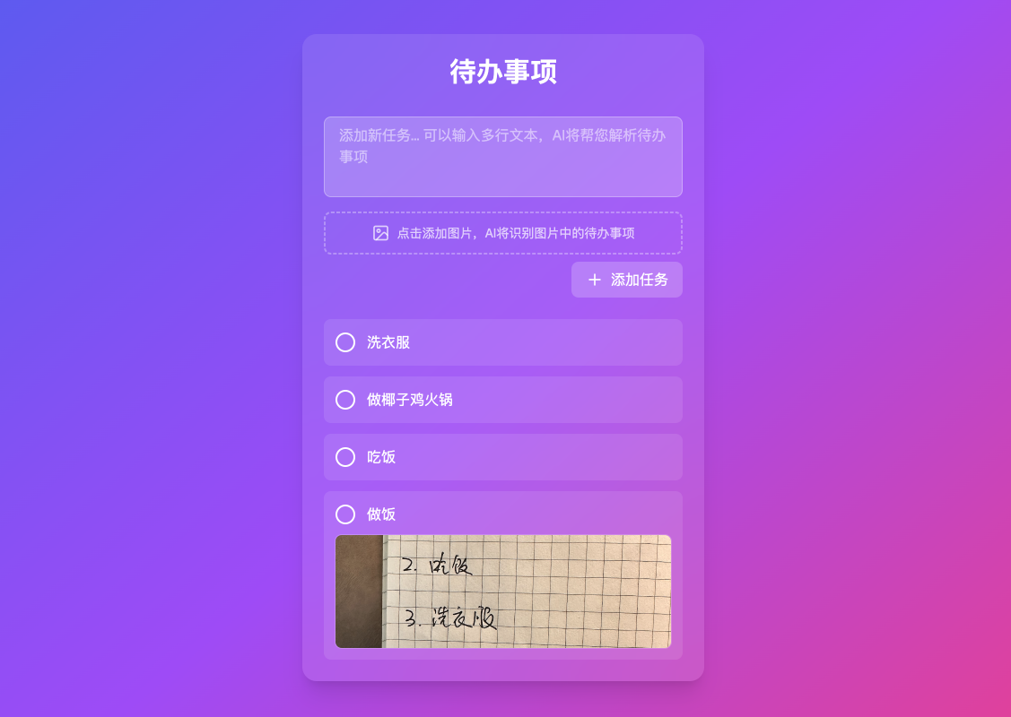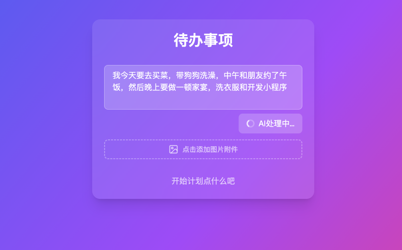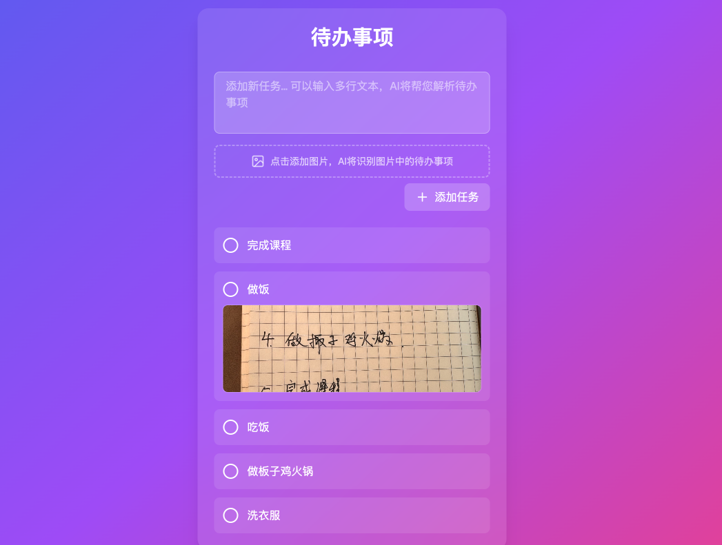 下面我们将这个应用改为Al版本的待办事项应用,能够一次性说完所有今天要做的事情, 然后ai会自动的帮你拆解今天的待办内容,并且你能够支持上传手写图片进行解析。
