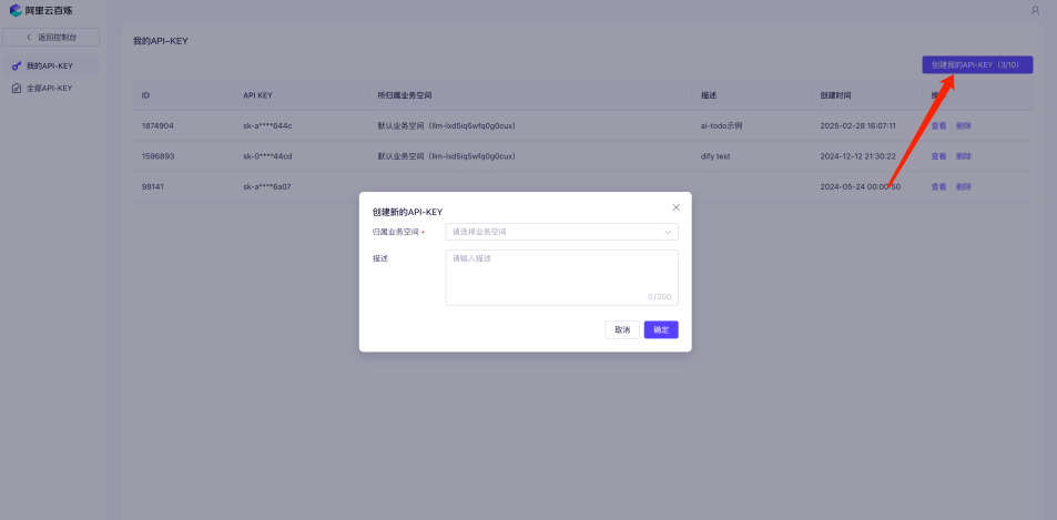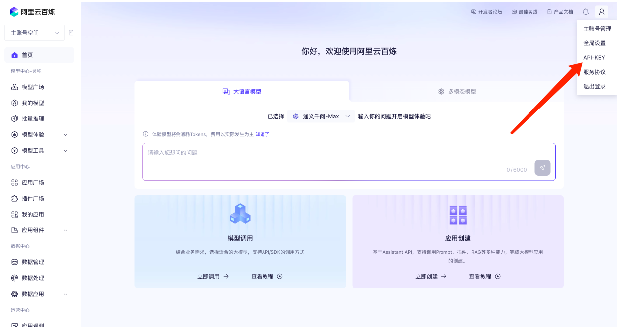 首先我们需要去到阿里百炼获取到APIKEY,首先进入到阿里云百炼平台。点击API-KEY