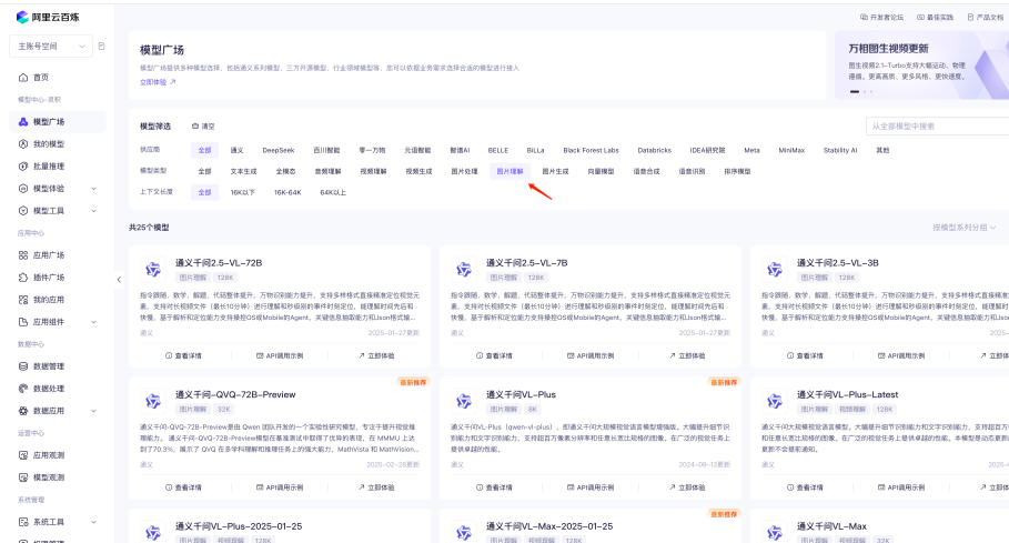 接下来,我们可以进入到首页的模型广场,选择一个有【图片理解】能力的模型