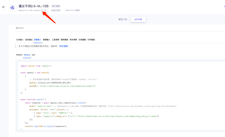 这边我们来使用通义干问2.5-VL-72B模型,点击进入「API调用示例」,有2个内容是你需要记住的:
