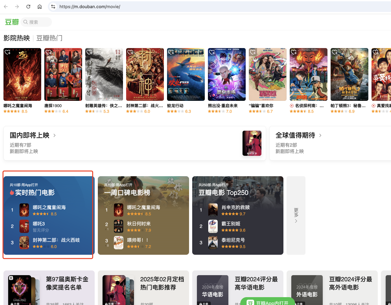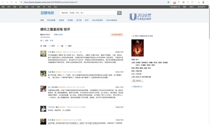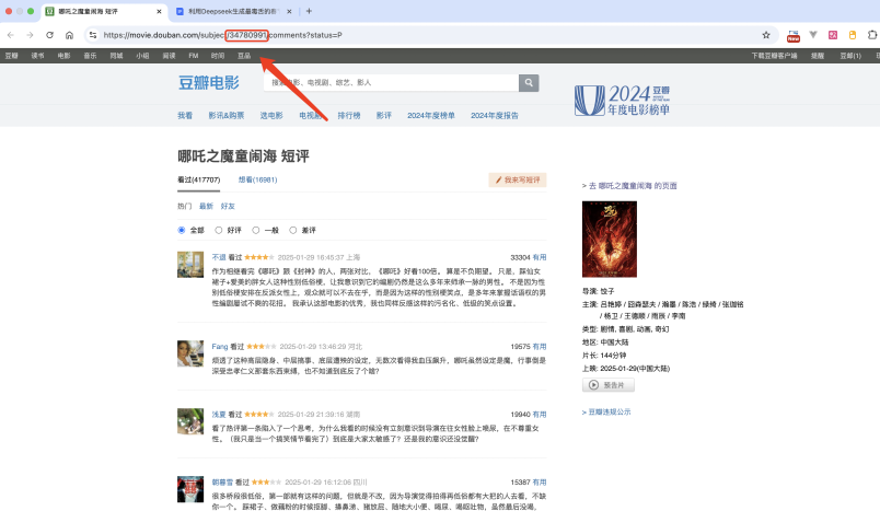 这一步很简单,因为豆瓣的电影id都是在链接上面公开可见的,以哪吒为例,这个 34780991 就是哪吒的电影id。复制并粘贴到刚才的代码中