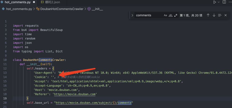 首先我们需要在这里手动填入你的cookie,cookie是你用户身份的标识,填入了才能避免你的爬虫请求不会被豆瓣列为恶意请求给禁用掉。