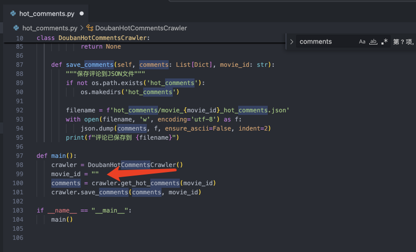 def main(): crawler = DoubanHotCommentsCrawler() movie_id = "" comments = crawler.get_hot_comments(movie_id) crawler.save_comments(comments, movie_id)