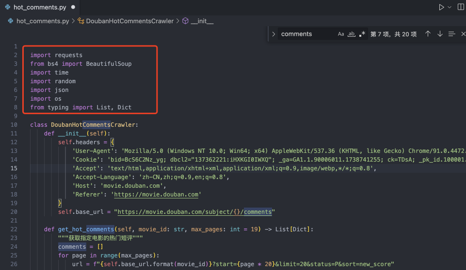 完成一个获取豆瓣电影热门短评的python爬虫代码,命名为hot_comments.py- 在项目根目录直接创建文件并给出详细的代码- headers 给出 cookie 变量,我需要手动填写- 获取所有热门短评,max_page默认19你会得到下面所示的Python代码: