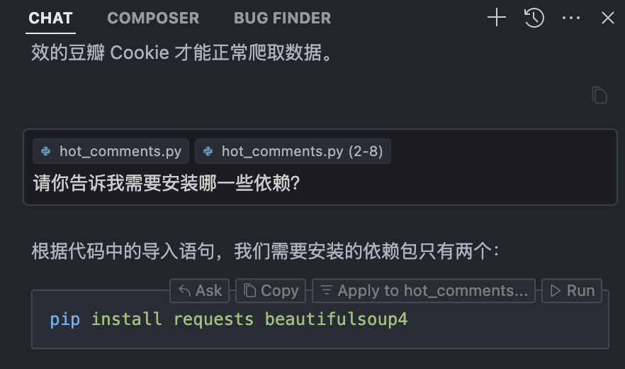 但是,我相信你不知道哪些库是需要安装的,因为有一些可能是Python标准库无需安装?那怎么知道我需要安装哪些库呢?很简单,在Cursor中问就好。你打开Cursor,然后提问:请你告诉我需要安装哪一些依赖?
