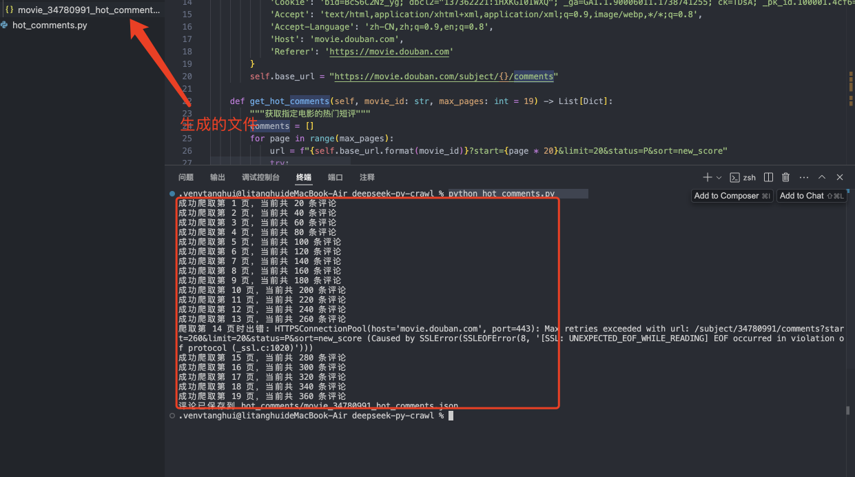 python hot_comments.py如果顺利的话,你应该就能看到执行成功,并且生成的json文件也在目录下面了。
