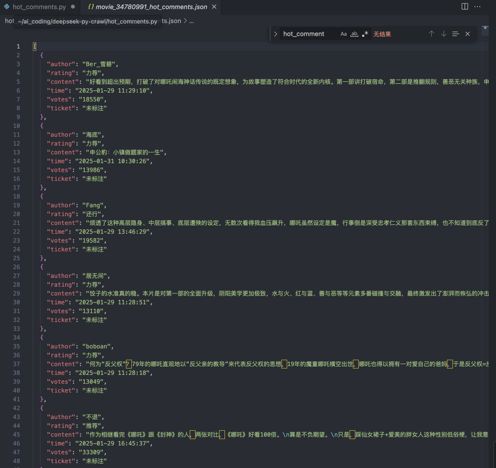filename = f'hot_comments/movie_{movie_id}_hot_comments.json' with open(filename, 'w', encoding='utf-8') as f: json.dump(comments, f, ensure_ascii=False, indent=2) print(f"评论已保存到 {filename}")