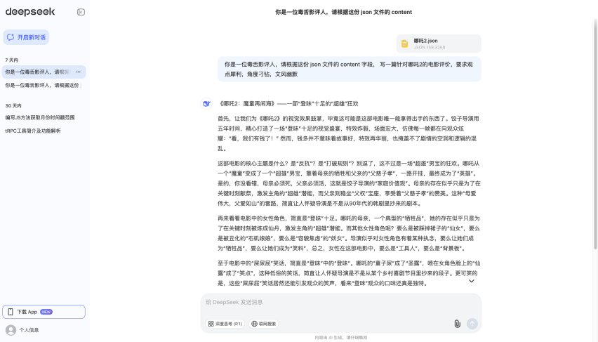 我这一步非常简单,让我们打开DeepSeek,然后将我们刚才获取到的JSON数据分别给到AI,并且输入以下提示词,让DeepSeek输出对应的毒舌电影影评