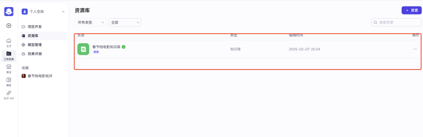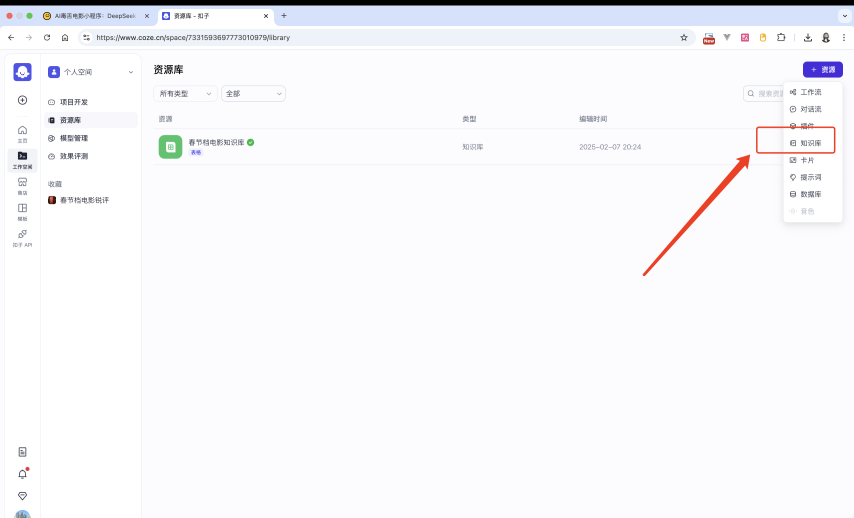 进入https://www.coze.cn/,点击「工作空间」进入到「资源库」当中。在右侧创建知识库: