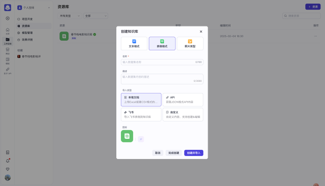 在中间的「知识」-「表格」中,引入我们刚才所创建的知识库。