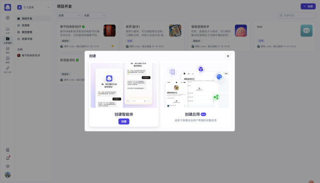 进入到项目开发当中,点击「创建」-「创建智能体」。