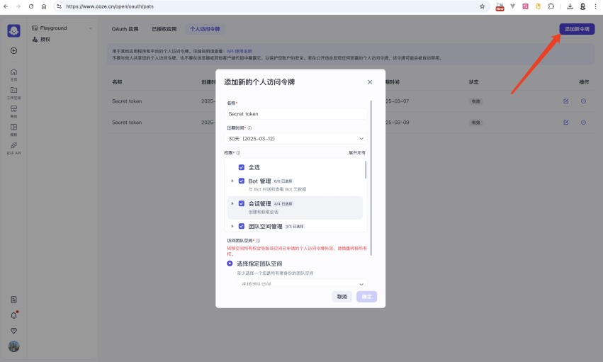 如果你是第1次配置扣子的API,那么需要点击配置,添加一个个人的令牌。