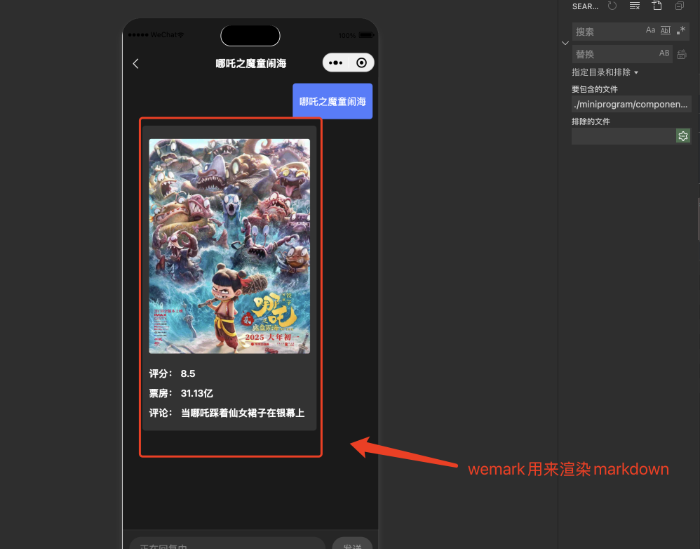 export default [ { name: "哪吒之魔童闹海", rate: 8.5, boxOffice: "31.13亿", cover: "https://s3.bmp.ovh/imgs/2025/02/03/36011e1579048097.jpeg", description: "哪吒之魔童闹海", }, { name: "唐探1900", rate: 6.5, boxOffice: "17.81 亿", cover: "https://s3.bmp.ovh/imgs/2025/02/03/83aff3ac57d92499.jpeg", description: "唐探1900", }, { name: "封神第二部:战火西岐", rate: 6.2, boxOffice: "8.88 亿", cover: "https://s3.bmp.ovh/imgs/2025/02/03/674852ca8db50492.jpg", description: "封神第二部:战火西岐", }, { name: "射雕英雄传:侠之大者", rate: 5.5, boxOffice: "5.56 亿", cover: "https://s3.bmp.ovh/imgs/2025/02/03/834dc403acb27e56.jpeg", description: "射雕英雄传:侠之大者", }, { name: "熊出没·重启未来", rate: 7.2, boxOffice: "4.32 亿", cover: "https://s3.bmp.ovh/imgs/2025/02/03/f994b69f157f180f.jpeg", description: "熊出没·重启未来", }, { name: "蛟龙行动", rate: 6.5, boxOffice: "2.22 亿", cover: "https://s3.bmp.ovh/imgs/2025/02/03/26e5bf8a4b8ab198.jpeg", description: "蛟龙行动", },];4.3.3 导入wemark
