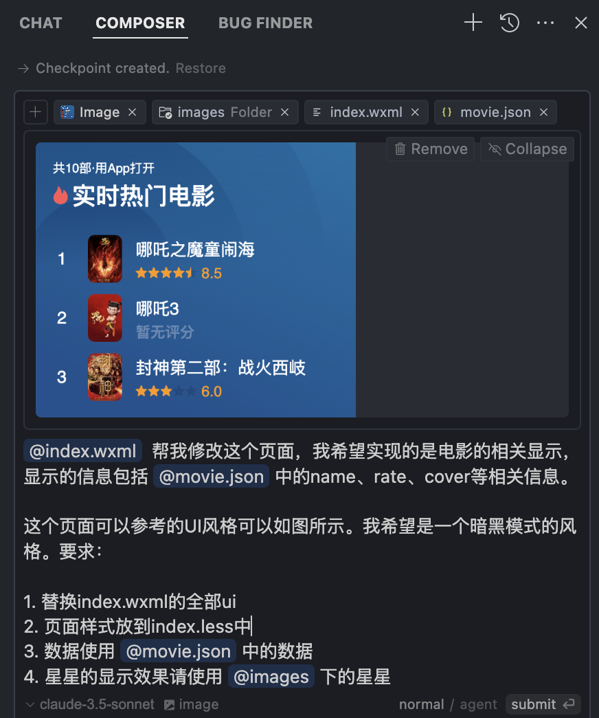 (2) 输入对应的提示词给到Cursor COMPOSER: