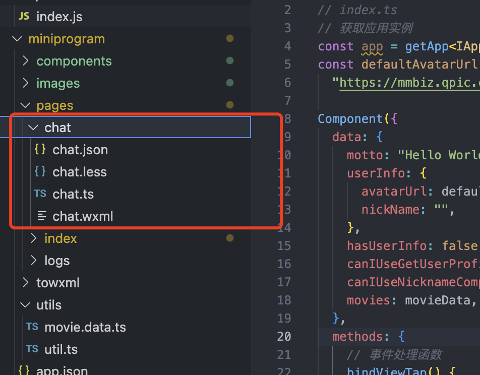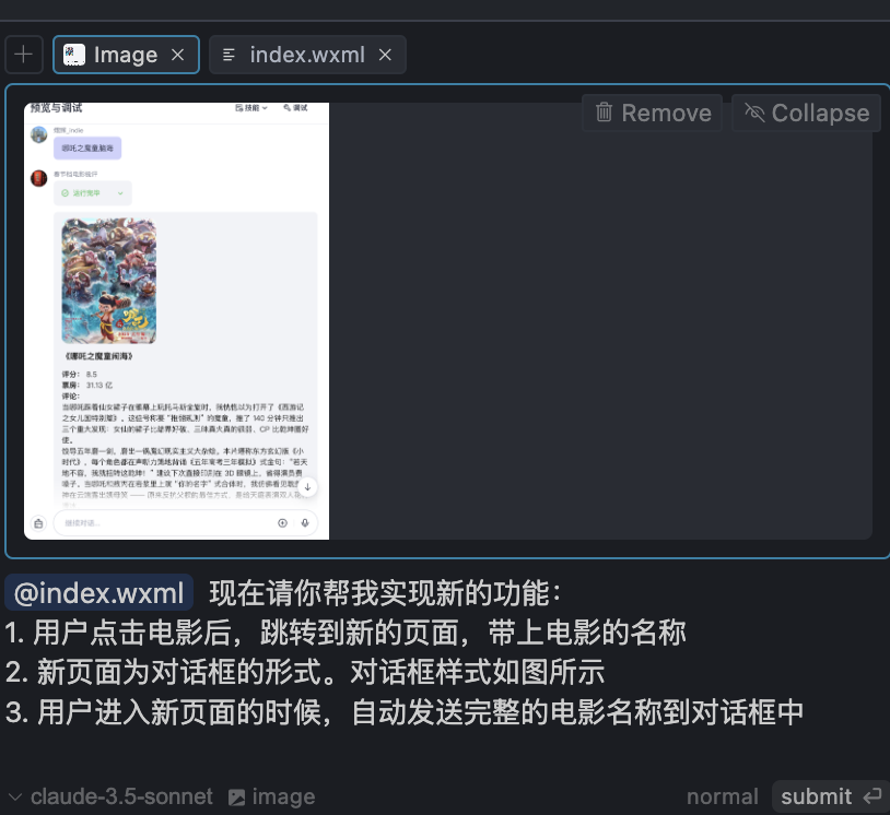 @index.wxml 现在请你帮我实现新的功能:1. 用户点击电影后,跳转到新的页面,带上电影的名称2. 新页面为对话框的形式。对话框样式如图所示3. 用户进入新页面的时候,自动发送完整的电影名称到对话框中这一部会生成这么几个文件,这一部AI可能会生成一些多余的代码,我们可以不用管他