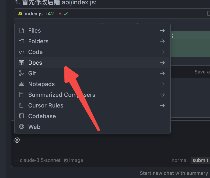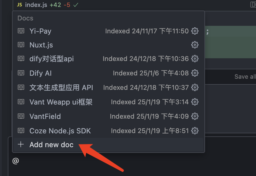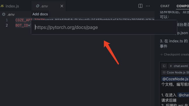 @CozeNode.js SDK快速开始 @Coze Node.js SDK 请你结合这两个文档,编写前后端代码,要求流程如下:1. 在进入 @chat.wxml 页面后,会自动发送消息到对话框,此时应该请求后端2. 后端的 api 在 @index.js 编写,后端需要使用 `@coze/api` ,请求后端coze的发送消息接口,使用流式输出3. 后端的数据输出结果输出到前端,实现markdown格式的渲染,使用4. 在请求期间,用户不允许发送消息,如果发送弹出提示5. 后端请求接口需使用到环境变量.env中的COZE_API_TOKEN 和 BOT_ID作为请求参数注意我们是将Coze的sdk的文档告诉了Cursor(提示词第1行的@),所以说他能更加的方便的编写相关的逻辑。这一步如果对在Cursor当中增加文档不太熟练的朋友,可以参考下面的步骤