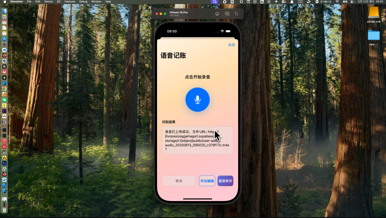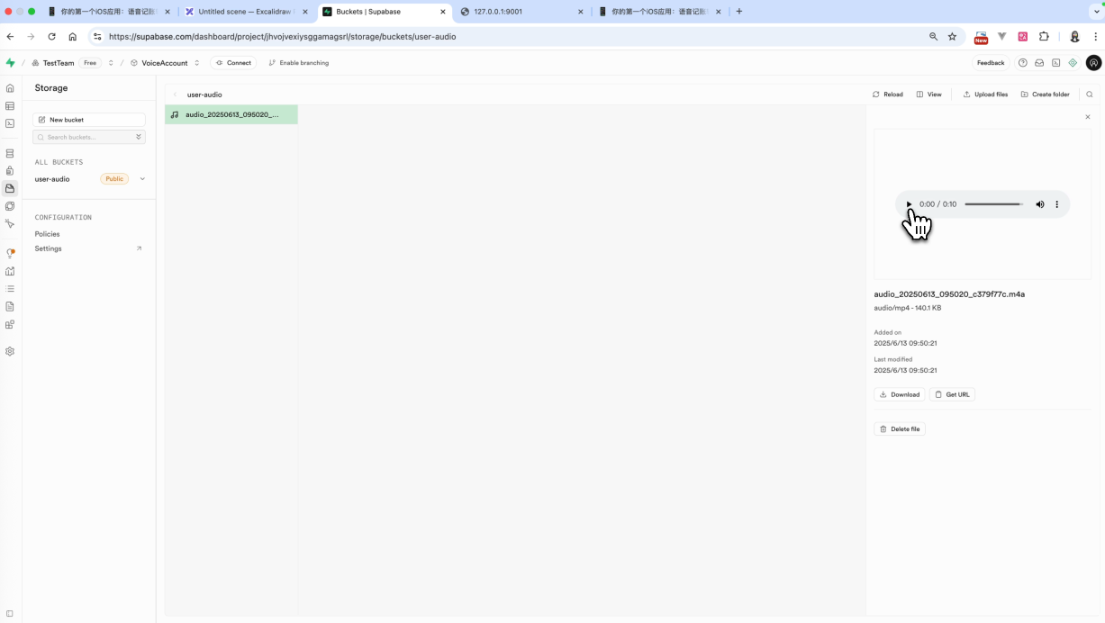 点击语音输入然后点击录音按钮。如果顺利的话,你就可以在supabase的storage中看到你刚才上传的那个音频文件了。就说明这个功能开发完成了。