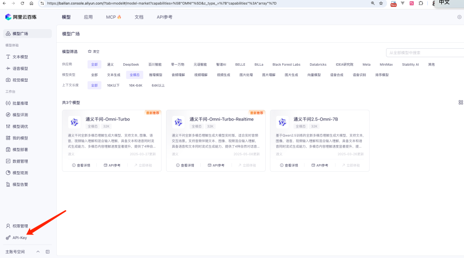 我们选择阿里云百炼当中的【通义千问-Omni-Turbo】模型,这个模型是一个全模态模型,支持文本/图像/音频/视频的解析。