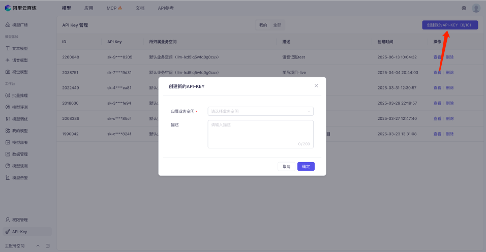 然后复制创建好的API KEY,将其填入到我们的 VoiceAccountServer/.env 文件中, 在.env中新增 DASHSCOPE_API_KEY,填入你刚才在阿里云百炼中获取到的API KEY