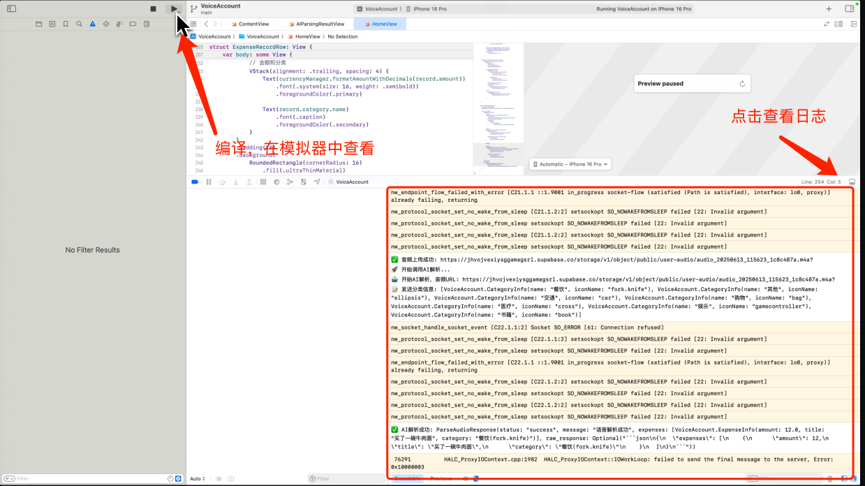 注意,这一步同样需要在模拟器中查看,点击编译按钮。你就可以打开模拟器。在调试过程中,注意打开控制台面板。来查看对应的日志信息,方便我们查看整个AI语音解析的流程。(如果你发现没有日志,你可以让AI添加上对应的日志信息)