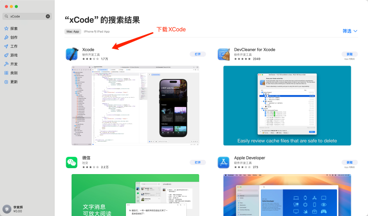 在进入这部分教程之前,如果你的电脑上还没有安装XCode,你需要先到App Store中安装XCode。
