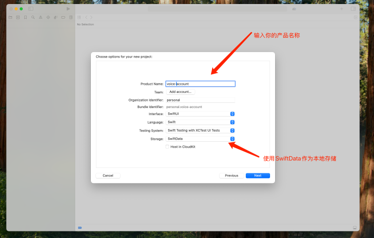 在 Product Name 中填入对应的产品名称,并在storage 中选择SwiftData。点击 【Next】,确认保存的文件目录即可。