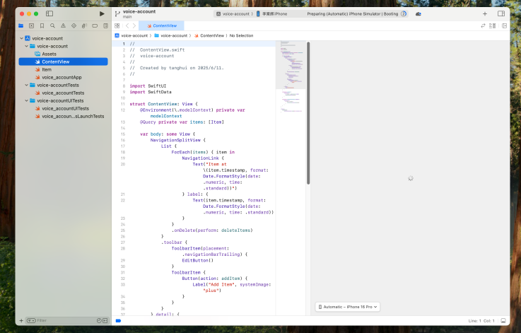 如果顺利的话,Cursor解决完成所有的报错信息后,你就可以点击 ContentView 这个页面,预览我们的项目成功跑起来了。