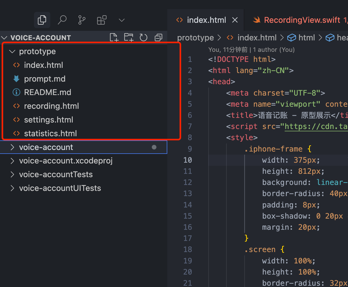 请你根据 @/prototype 下面的原型图,创建对应的iOS页面,在 @/VoiceAccount 文件夹下,创建对应的app页面。目前分别有4个页面,要求尽可能的还原样式。注意 @index.html 不用还原,它是一个概览页面,只需要还原其他4个页面就好。@文件夹和文件的操作需要自己手动选择,直接复制粘贴可能会失效哦!