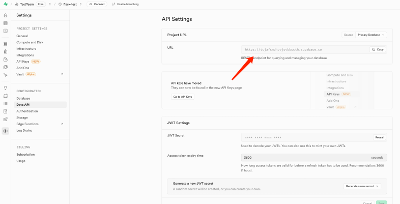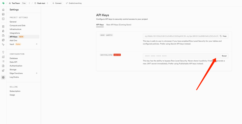 新建supabase项目,获取到对应的Project URL和服务端私钥