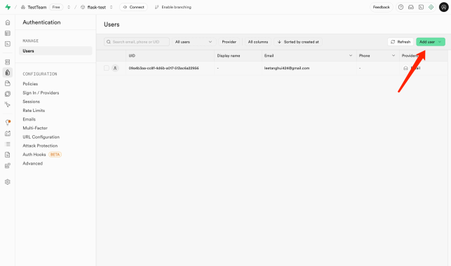 重新在命令行中输入python app.py,运行起来项目。然后在supabase中点击【Add user】添加用户。创建一个新的用户
