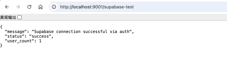 然后访问 http://localhost:9001/supabase-test , 如果顺利你会发现你的Flask应用成功连接了Python。