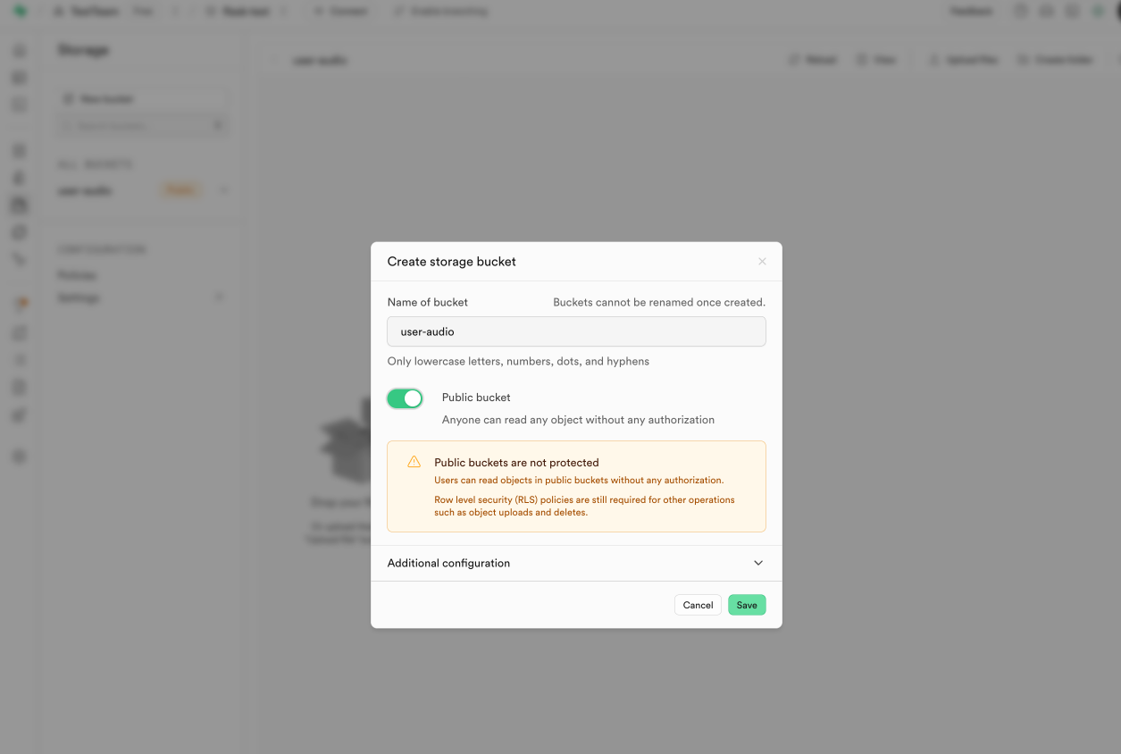 在Supabase的Storage中点击【New Bucket】按钮,新建一个存储桶,叫做 user-audio。同时设置为Public bucket。